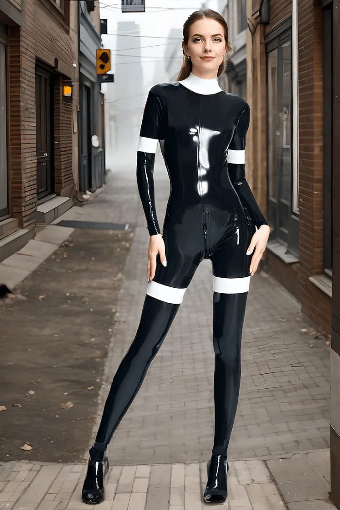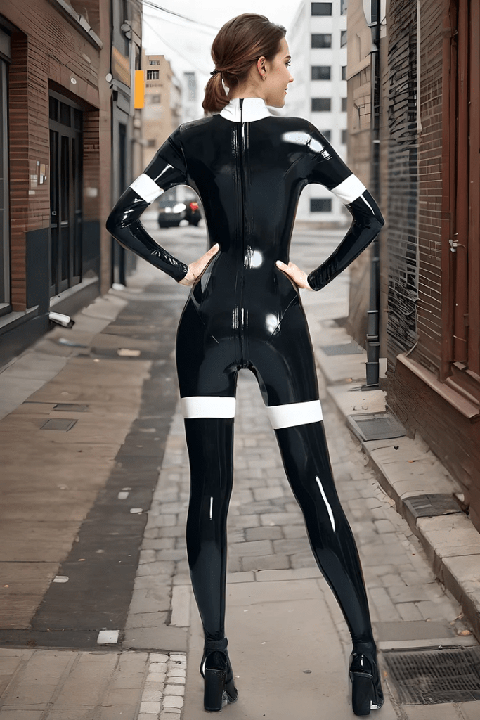 What truly sets this outfit apart is the use of bold white striping on the high collar, cuffs, and thighs. These carefully placed lines break the monotony of the black latex and add a crisp, graphic quality to the look. It’s a simple touch—but one that amplifies the visual impact.